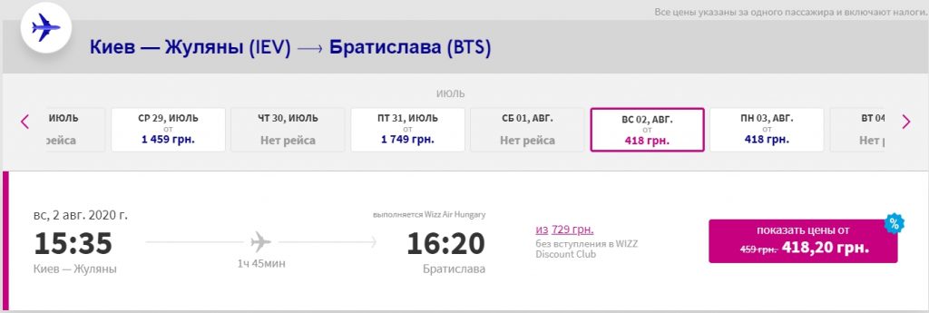 Пример бронирования со скидкой на рейс Киев – Братислава: