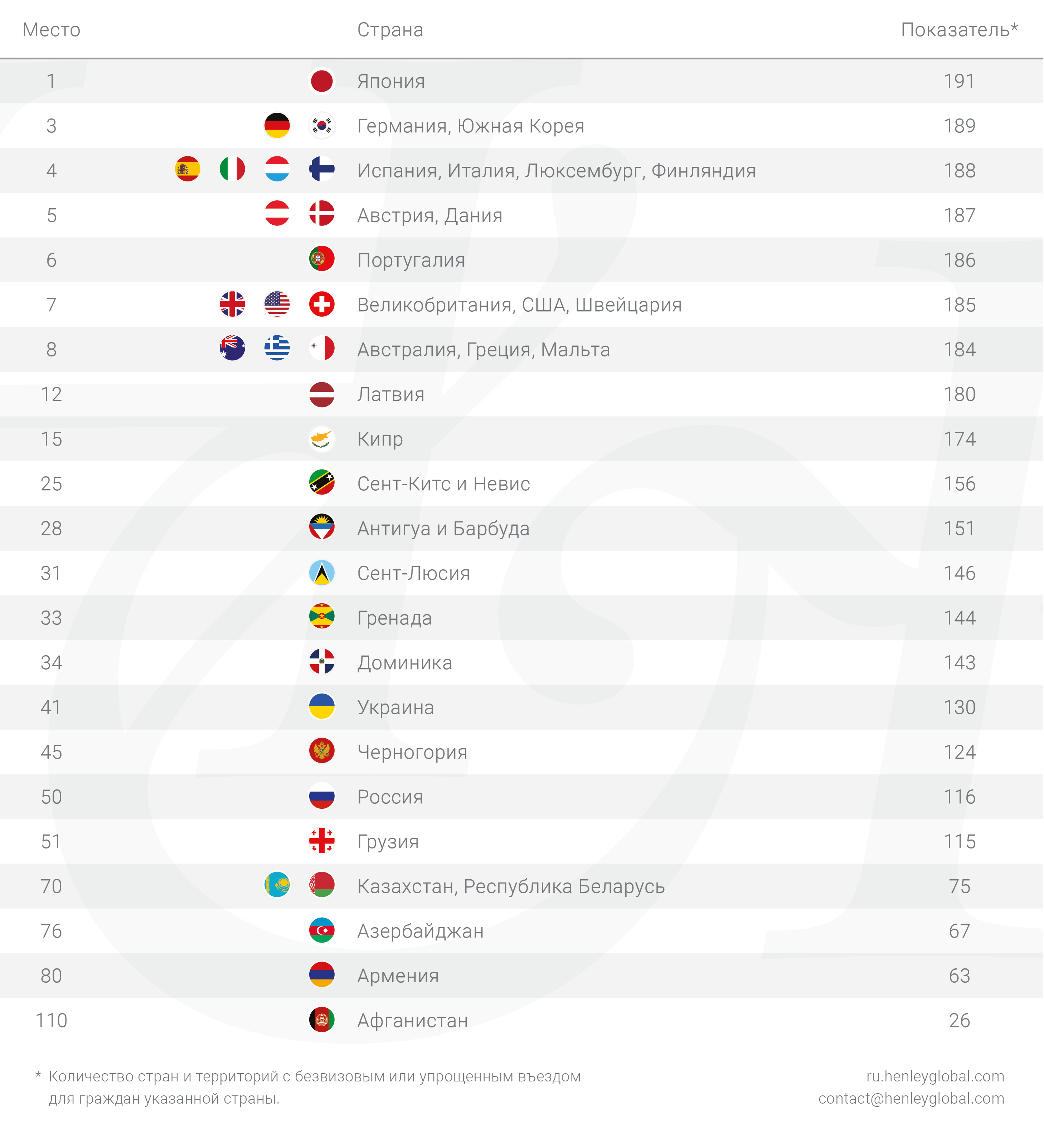 У першому рейтингу в нинішньому році списку перше місце дісталося Японії, громадяни якої можуть без віз або з візами після прибуття потрапити в 191 країну світу. На другому місці – Сінгапур (190 країн), третє місце розділили між собою Південна Корея і Німеччина (по 189 країн).