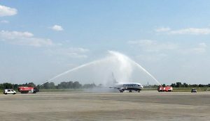 В Киеве экипаж Boeing 737-800 встретили водяной радугой и устроили для гостей из Ирландии фотосессию на перроне терминала D.